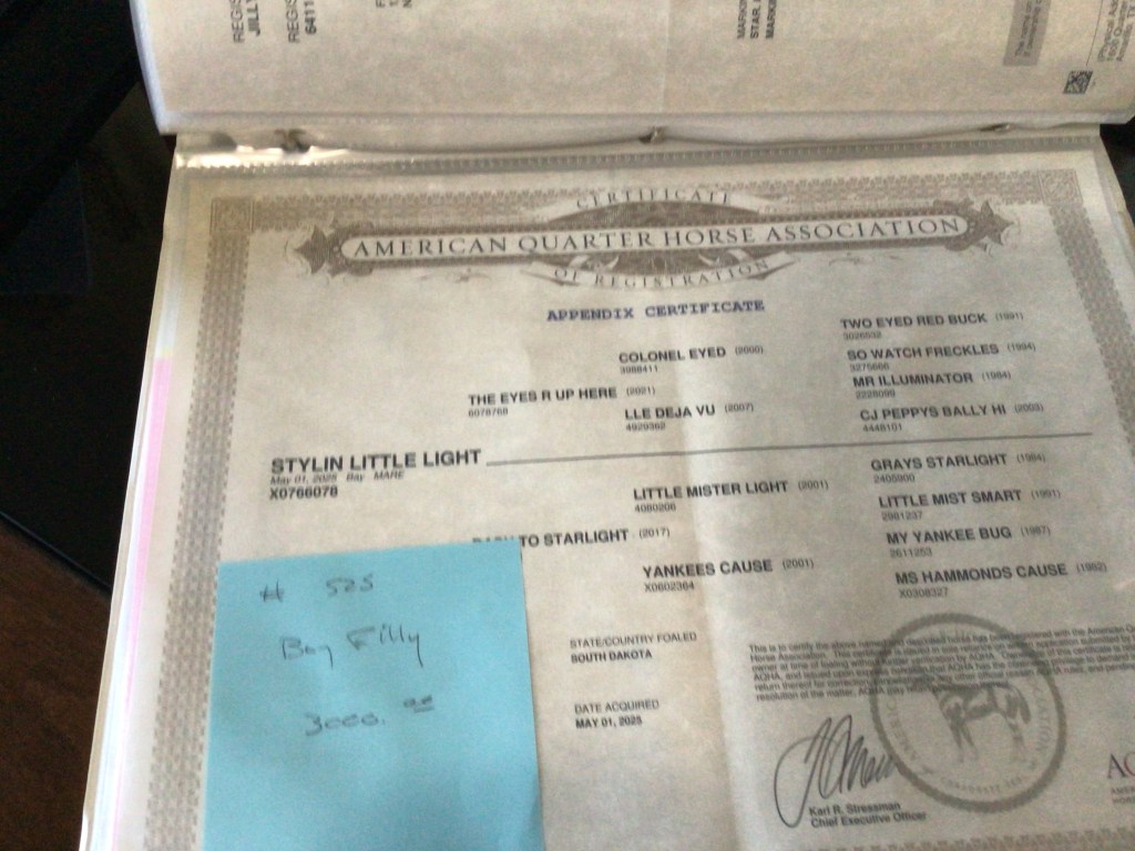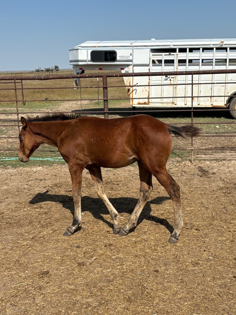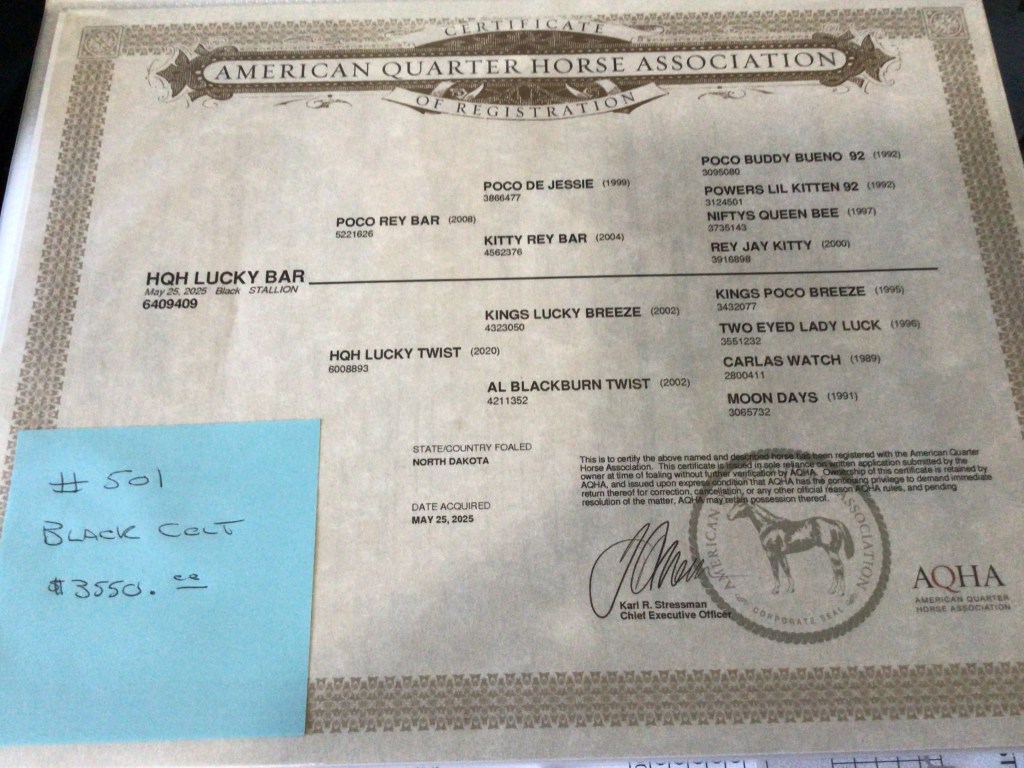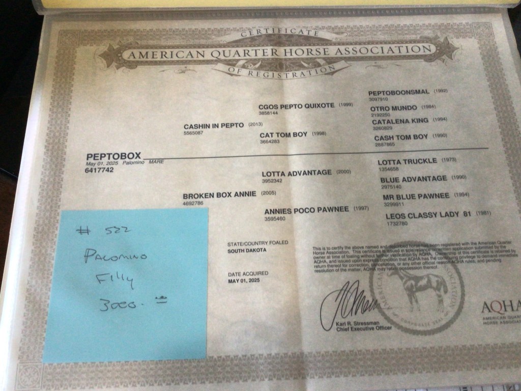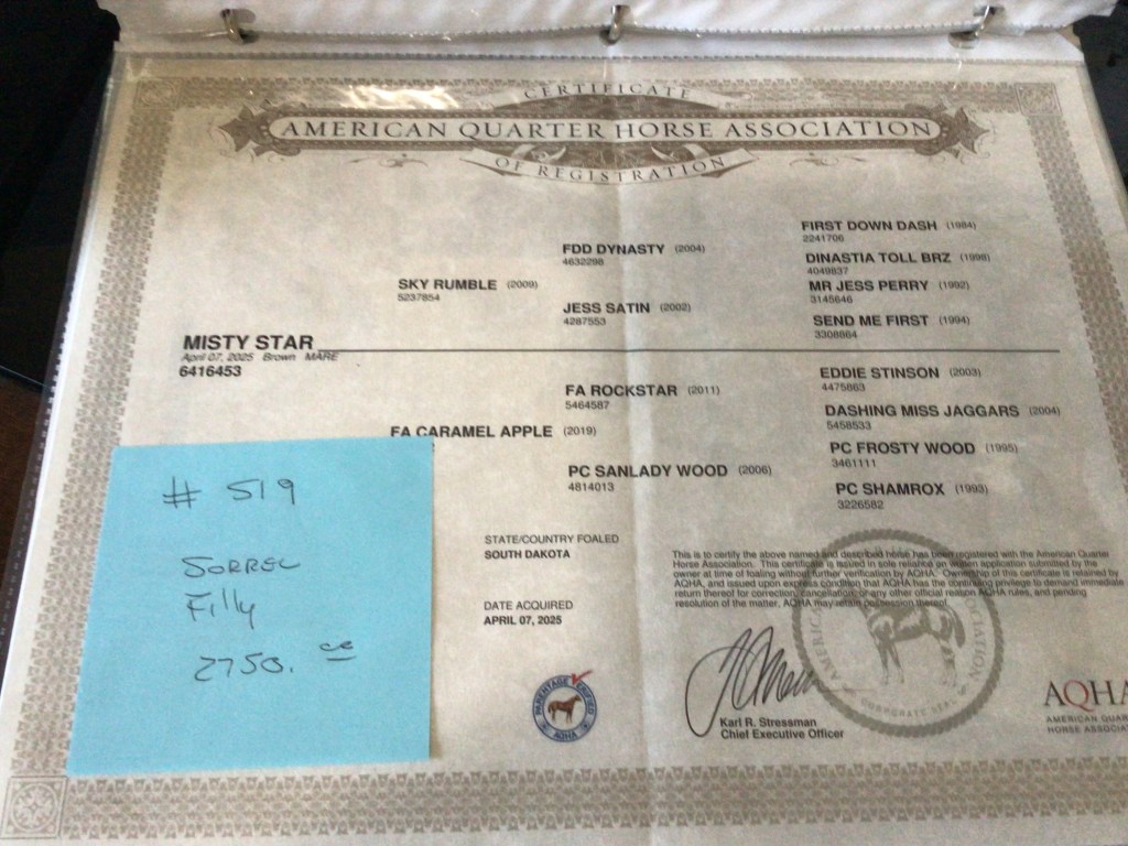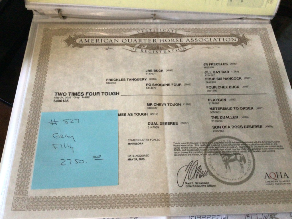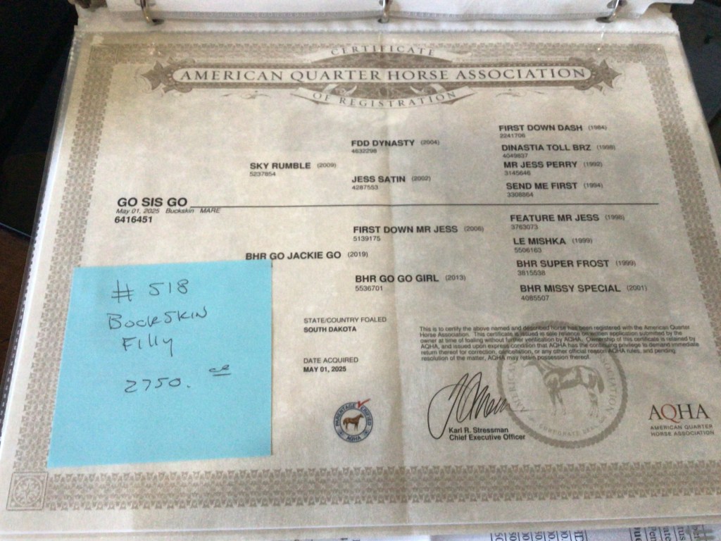 Selling as grade. Both dam and sire are registered (see above pictures), but the registration application for this filly were never sent by previous owner. I will provide the previous owners phone number for you to contact if you want to register her.