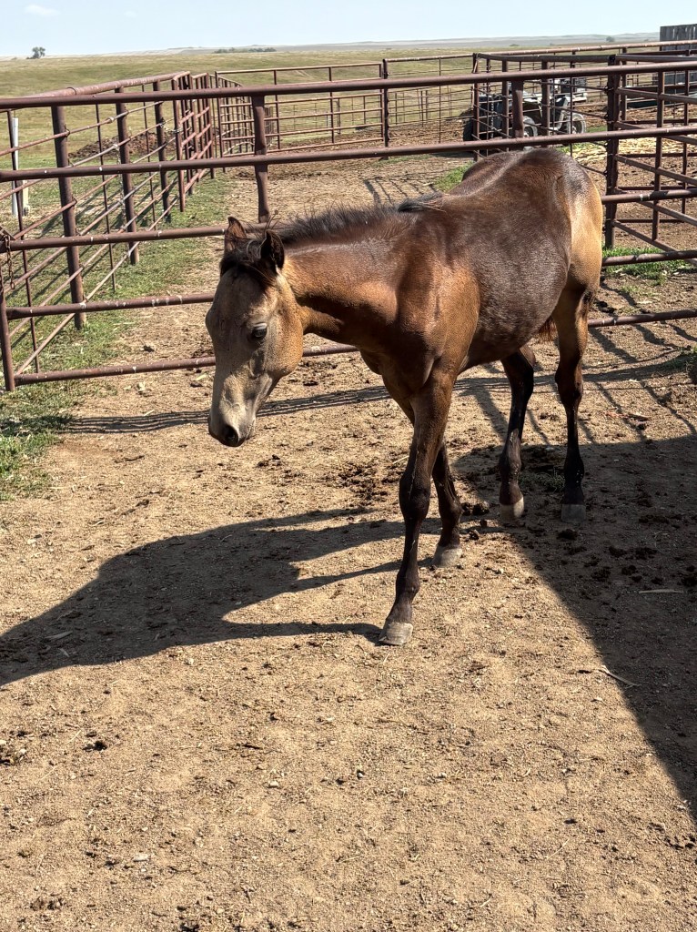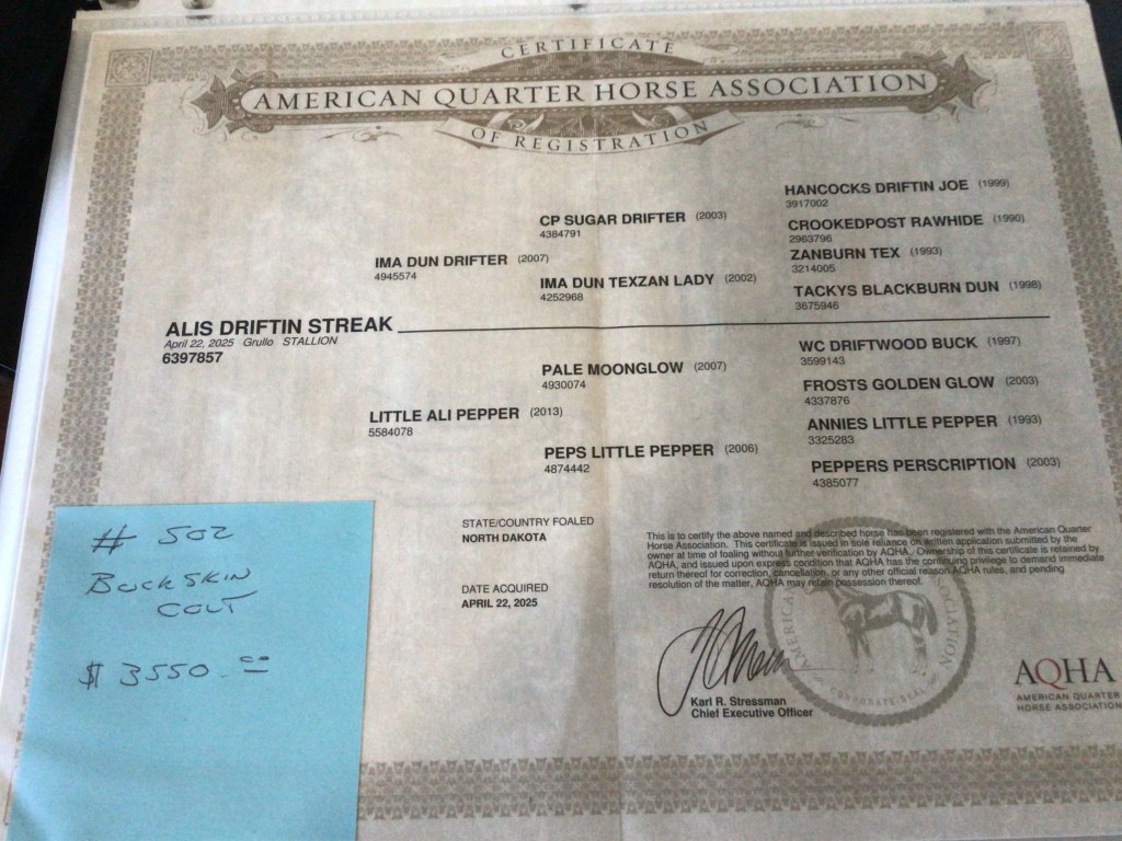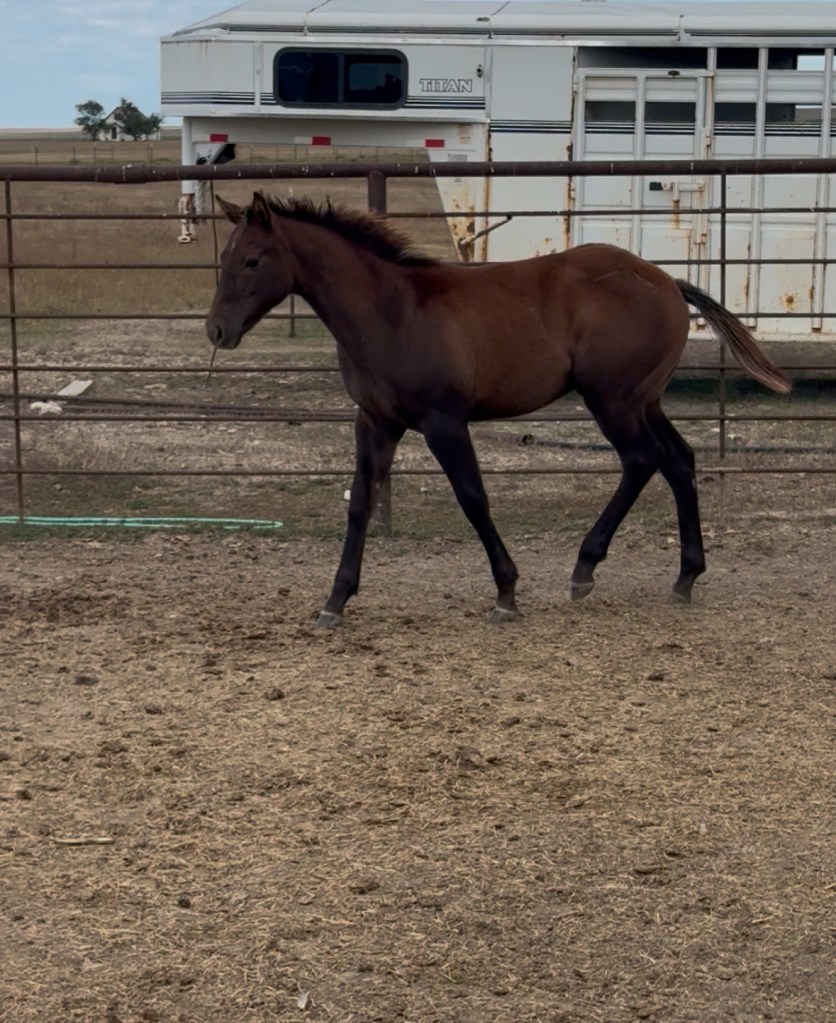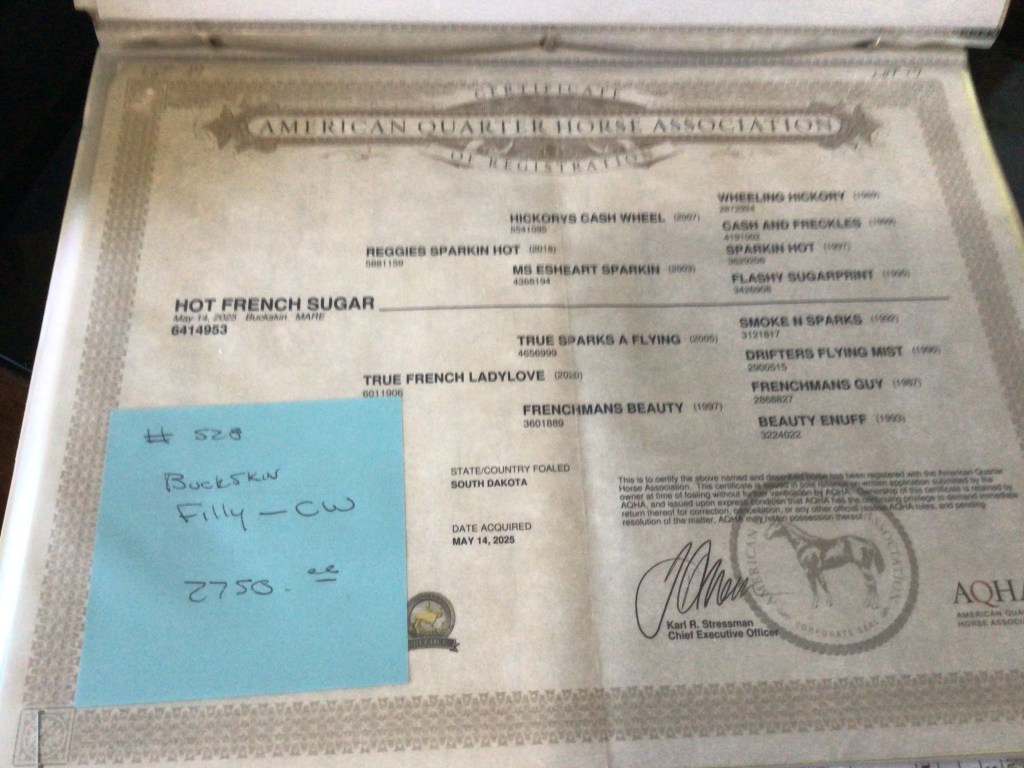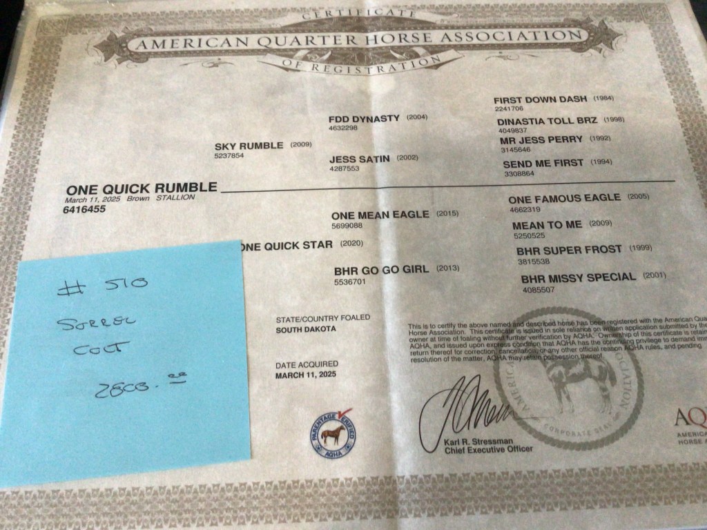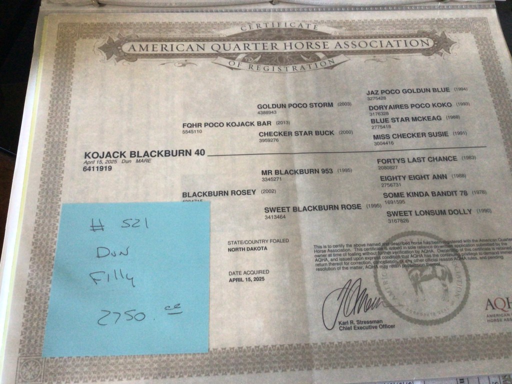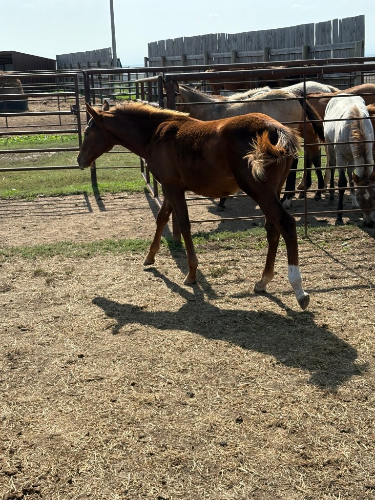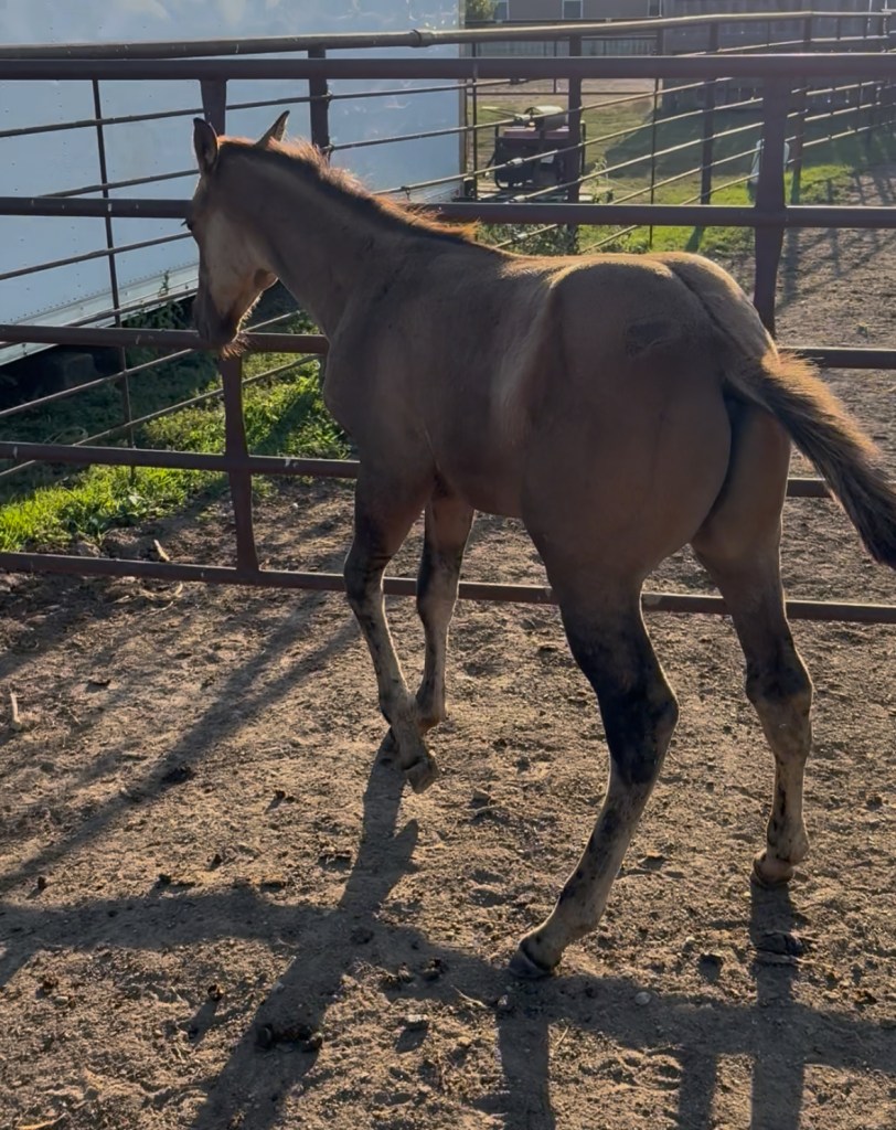 Selling as grade. Both dam and sire are registered (see above pictures), but the registration application for this filly were never sent by previous owner. I will provide the previous owners phone number for you to contact if you want to register her.